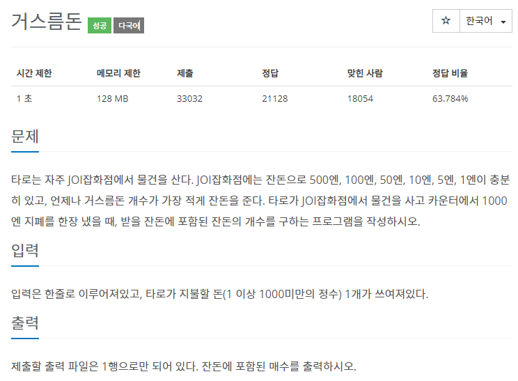 타로는 자주 JOI잡화점에서 물건을 산다. JOI잡화점에는 잔돈으로 500엔, 100엔, 50엔, 10엔, 5엔, 1엔이 충분히 있고, 언제나 거스름돈 개수가 가장 적게 잔돈을 준다. 타로가 JOI잡화점에서 물건을 사