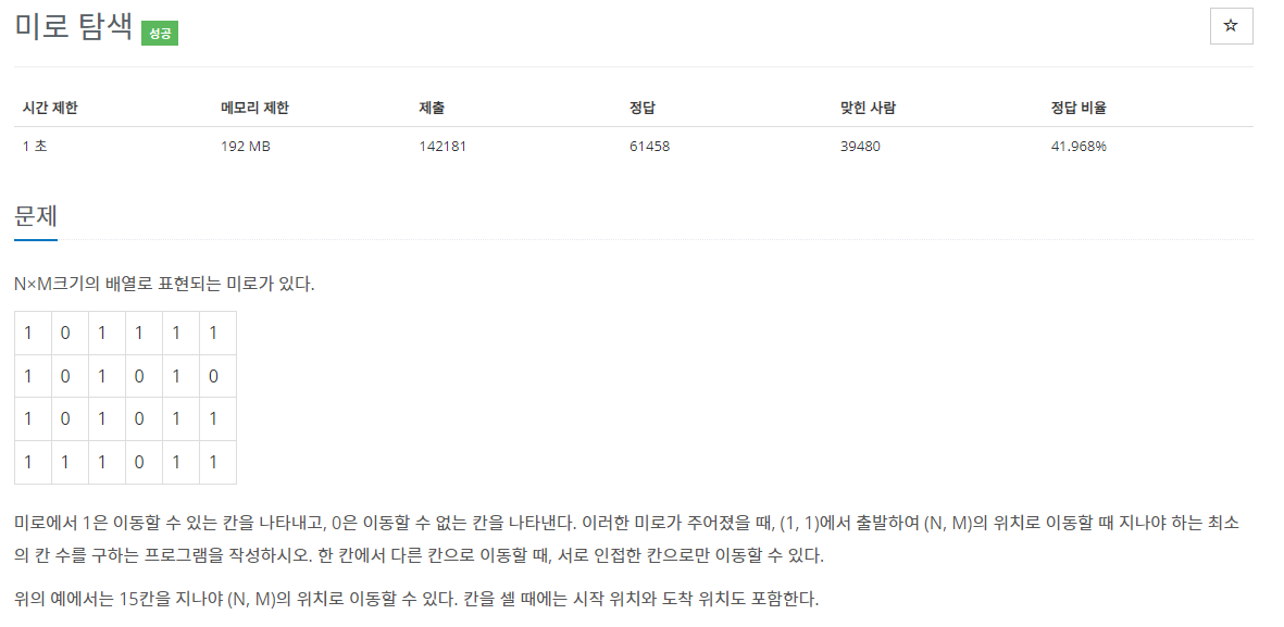 첫째 줄에 두 정수 N, M(2 ≤ N, M ≤ 100)이 주어진다. 다음 N개의 줄에는 M개의 정수로 미로가 주어진다. 각각의 수들은 붙어서 입력으로 주어진다.