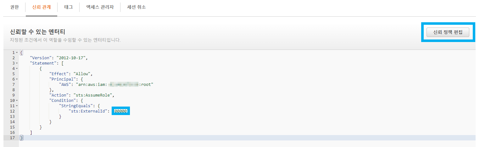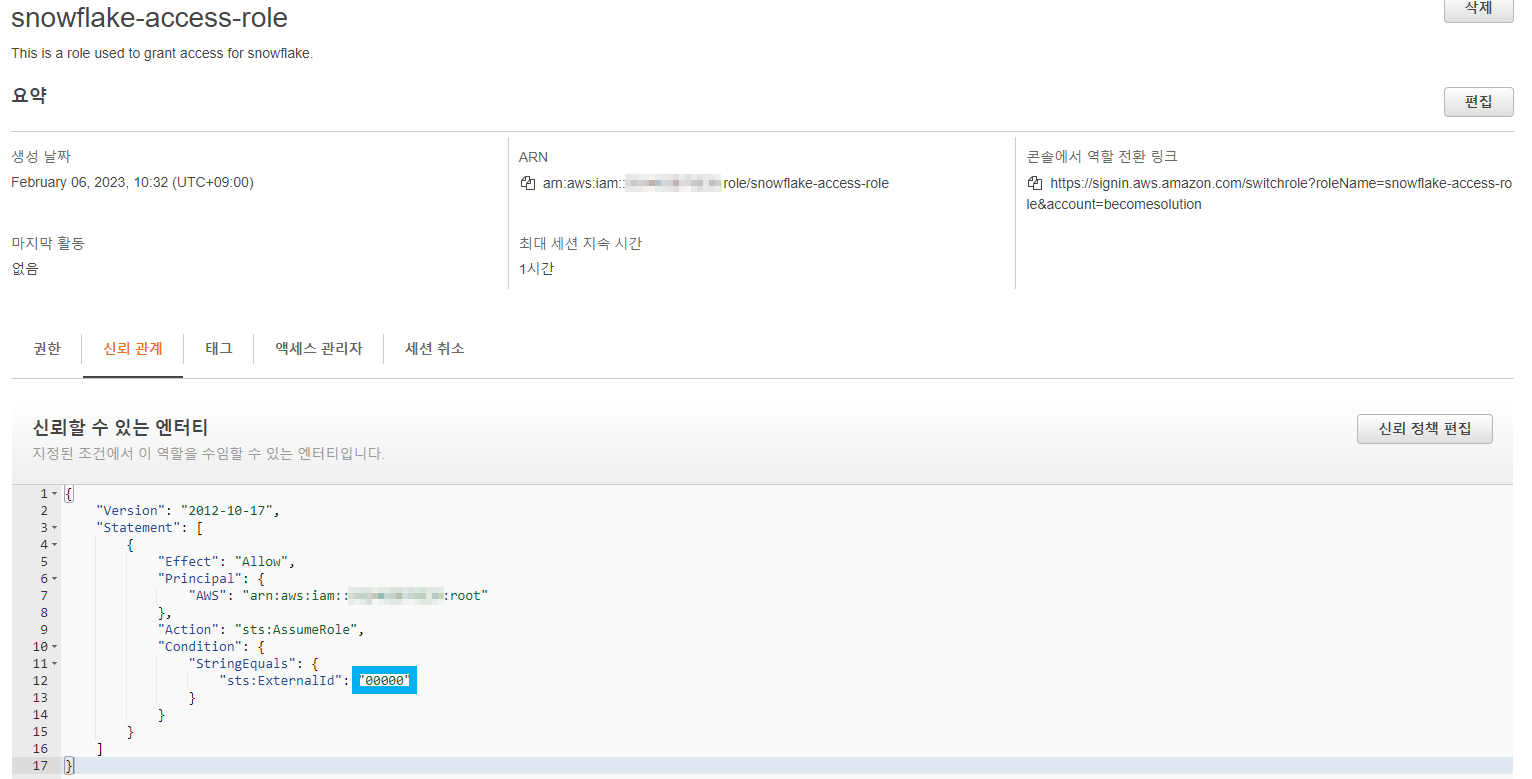 - IAM에서 생성한 snowflake role 신뢰 정책 편집 - STORAGE_AWS_EXTERNAL_ID 값 붙여넣기