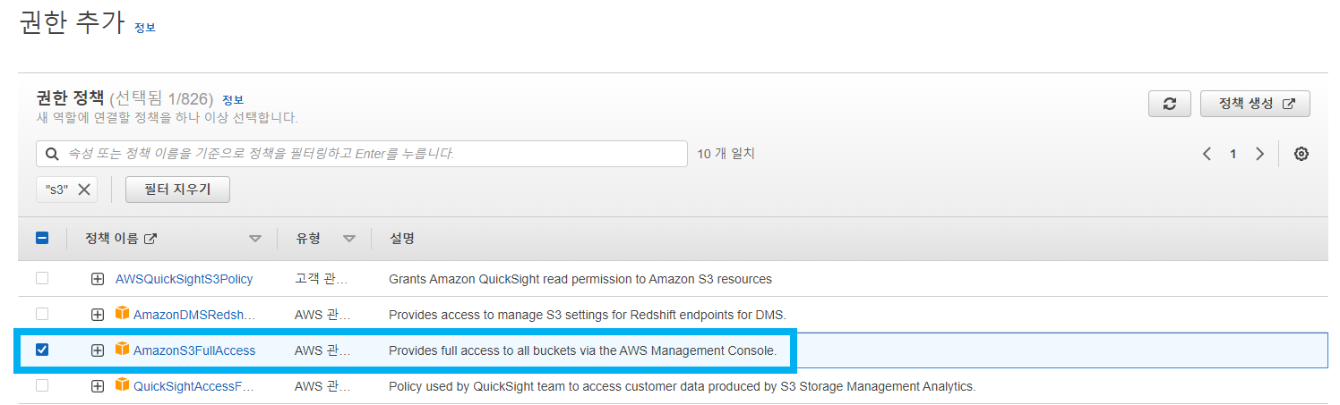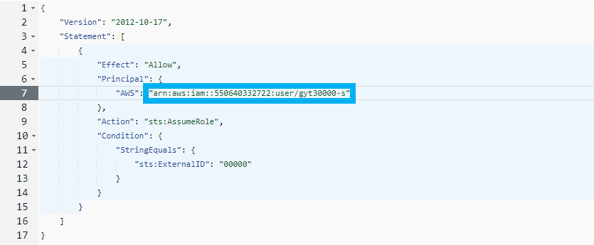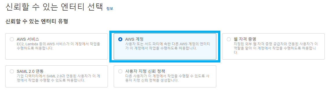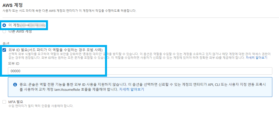 - AWS 계정 옵션에 외부 ID 필요 선택(더미로 '00000' 적용)