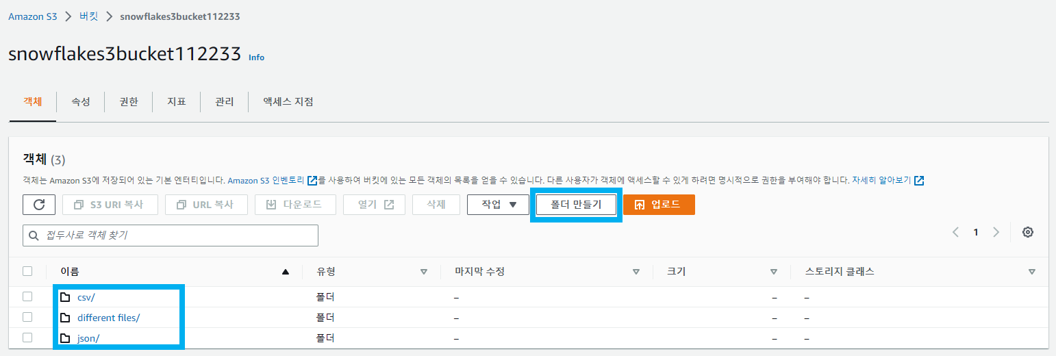- storage integration 객체 생성(ACCOUNTADMIN role로 생성 가능)