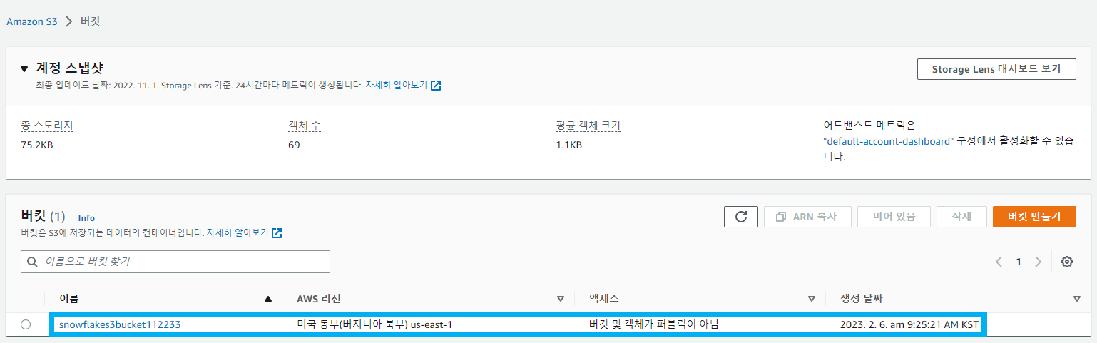 - AWS 리전 : Snowflake에서 선택한 동일한 리전을 선택함(동일한 리전끼리는 데이터 전송 비용이 무료임)