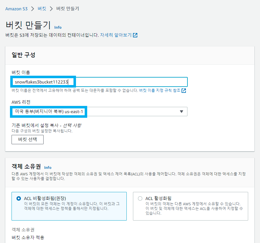 - 버킷 이름 설정 : 버킷 이름은 전역에서 고유해야 함