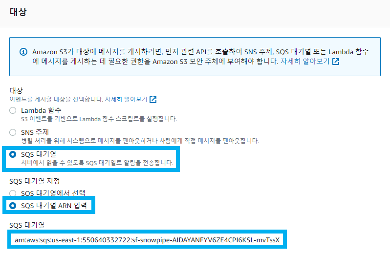 - 대상 : SQS 대기열 선택 및 SQS 대기열 ARN 입력란에 위에서 복사한 notification_channel값 입력