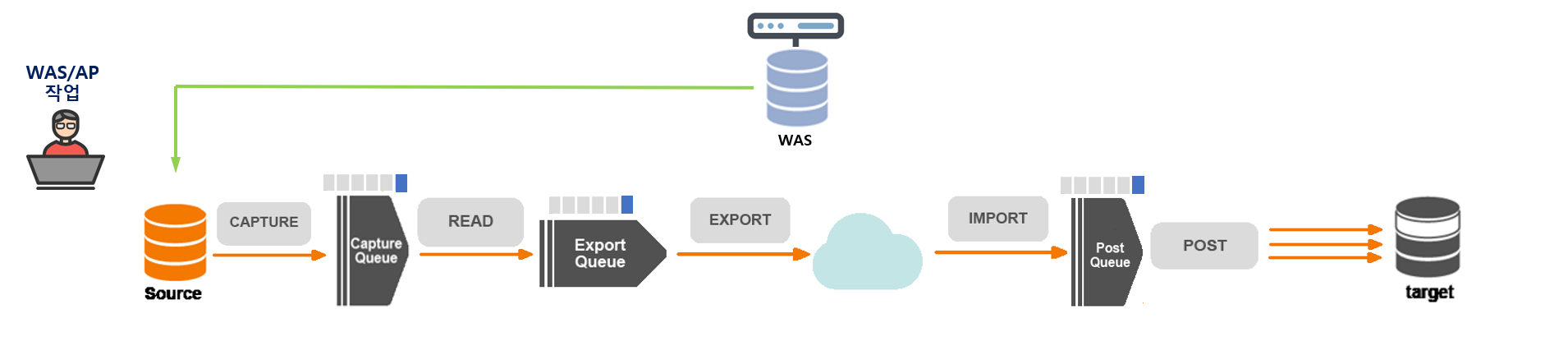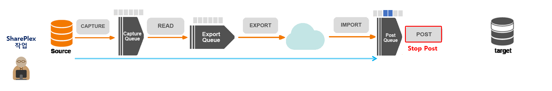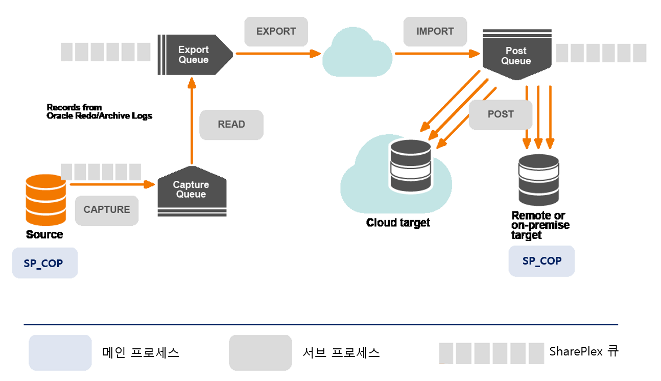 SP_COP 이라는 메인 프로세스로부터 통제되는 서브 프로세스(CAPTURE, READ, EXPORT, IMPORT, POST)로 구성된다. 소스 데이터베이스에서 Capture Queue에 가져오는 CAPTURE 프로세스, Capture Queue에서 데이터를 읽어들여 Export Queue로 보내주는 READ 프로세스, Export Queue의 데이터를 TCP 통신으로 보내주는 EXPORT 프로세스는 소스 데이터베이스 서버에서 구동된다. 타겟 데이터베이스 서버에서는 TCP통신으로 데이터를 받아 Post Queue에 보내주는 IMPORT 프로세스와 최종적으로 타겟 데이터베이스(Cloud 또는 On-premise)로 데이터를 보내주는 POST 프로세스로 구성되어 있다.