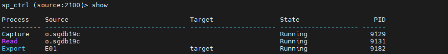 sp_ctrl> show --> 프로세스 기동 확인(Capture, Read, Export)