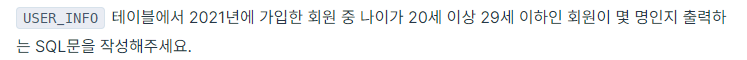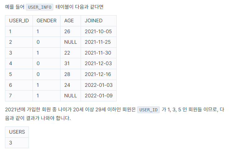 WHERE YEAR(JOINED) = 2021 AND AGE BETWEEN 20 AND 29;'SQL > 프로그래머스' 카테고리의 다른 글