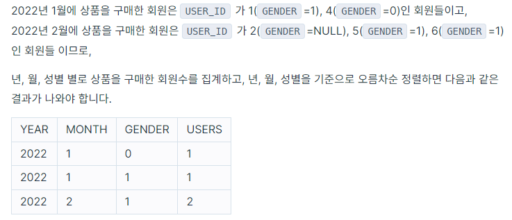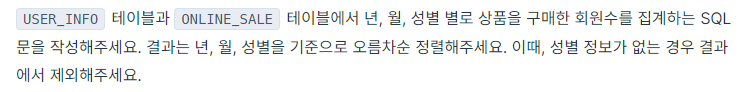 SELECT YEAR(SALES_DATE) "YEAR", MONTH(SALES_DATE) MONTH, GENDER, COUNT(DISTINCT(B.USER_ID)) USERS