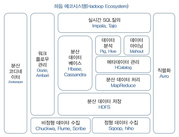 - 하둡의 서브 프로젝트 : 나머지 프로젝트 → 워크플로우 관리, 데이터 마이닝, 분석, 수집, 직렬화 등