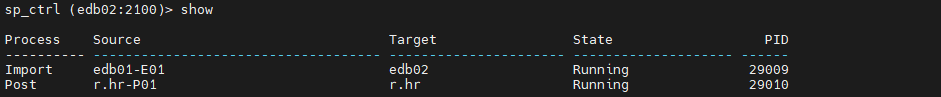 sp_ctrl> show --> 프로세스 기동 확인(Import, Post)