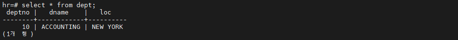 hr=# INSERT INTO dept VALUES (10,'ACCOUNTING','NEW YORK');