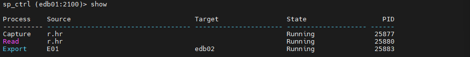 sp_ctrl> show --> 프로세스 기동 확인(Capture, Read, Export)