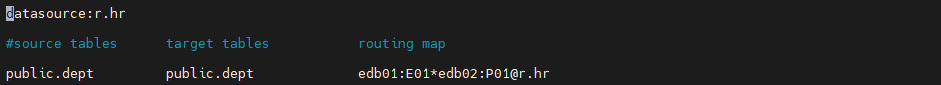 소스 connections.yaml 파일에서 확인한 값을 첫 줄의 datasource: 뒤에 작성하고, 타겟 connections.yaml 파일에서 확인한 값을 routing map에 작성한다. 소스와 타겟에 미리 생성한 public 스키마의 dept 테이블을 매핑했다.