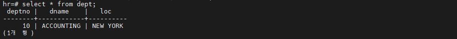 hr=# INSERT INTO dept VALUES (10,'ACCOUNTING','NEW YORK');