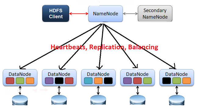 네임노드는 파일과 디렉터리의 읽기(open), 닫기(close), 이름 바꾸기(rename)등 파일 시스템의 네임스페이스의 여러 기능을 수행한다. 또한, 데이터 노드와 블록들의 맵핑을 결정한다. 데이터 노드는 파일 시스템의 클라이언트가 요구하는 읽기(read), 쓰기(write) 기능을 담당한다. 데이터 노드는 네임 노드에서의 생성, 삭제, 복제 등과 같은 기능도 수행한다.
