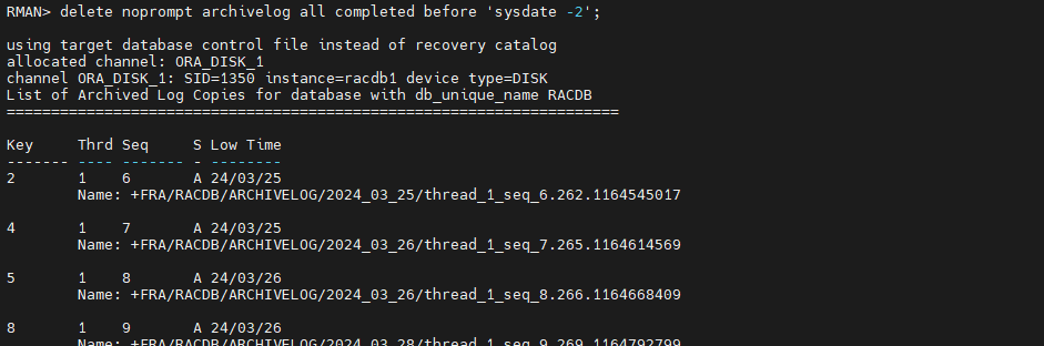 RMAN> delete noprompt archivelog all completed before 'sysdate -2';