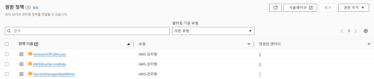 S3의 데이터를 접근하기 위한 AmazonS3FullAccess, Glue 서비스를 위한 AWSGlueServiceRole, 보안 암호를 위한 SecretsManagerReadWrite 권한을 가진 역할을 생성합니다.
