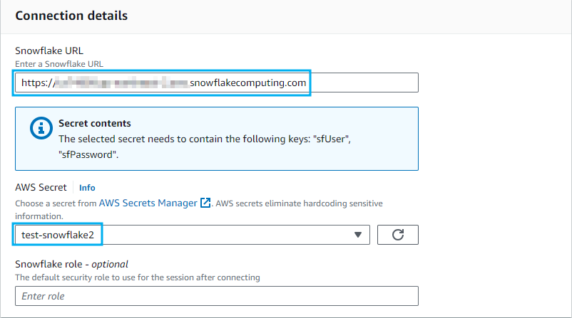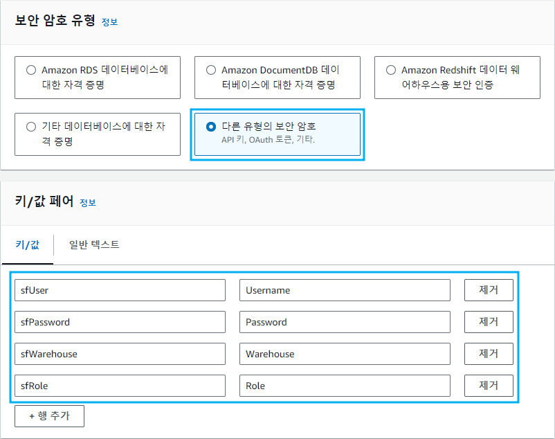 값에 Snowflake의 User, Password, Warehouse, Role을 입력합니다.