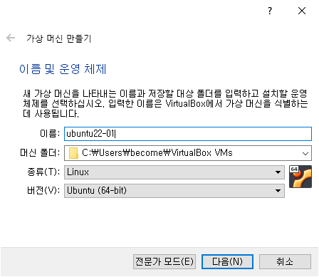ubuntu22.04버전을 적용할 예정이기 때문에 이름을 ubuntu22로 하고, 3대를 생성할 것이기 때문에 뒤에 01로 정하였다.