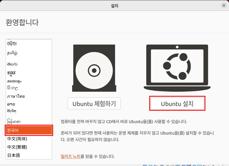 3) 실행 후, 언어 선택 및 ubuntu를 설치 합니다. 계정도 만들어준다.