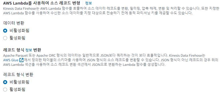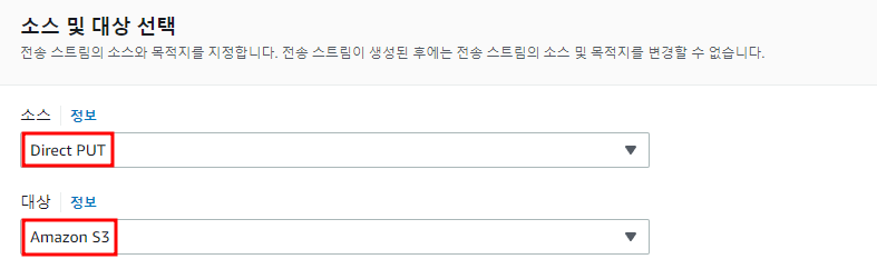 - 소스 : Direct PUT - 실시간 데이터가 아니라 직접 소스를 올리기 때문에 Direct PUT으로 설정