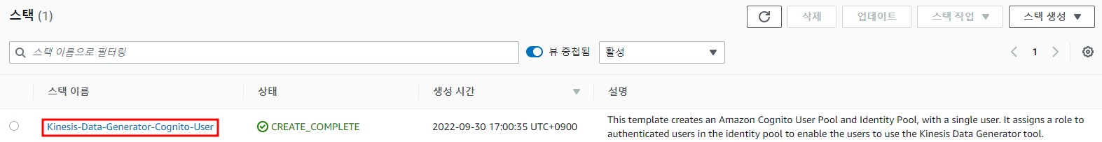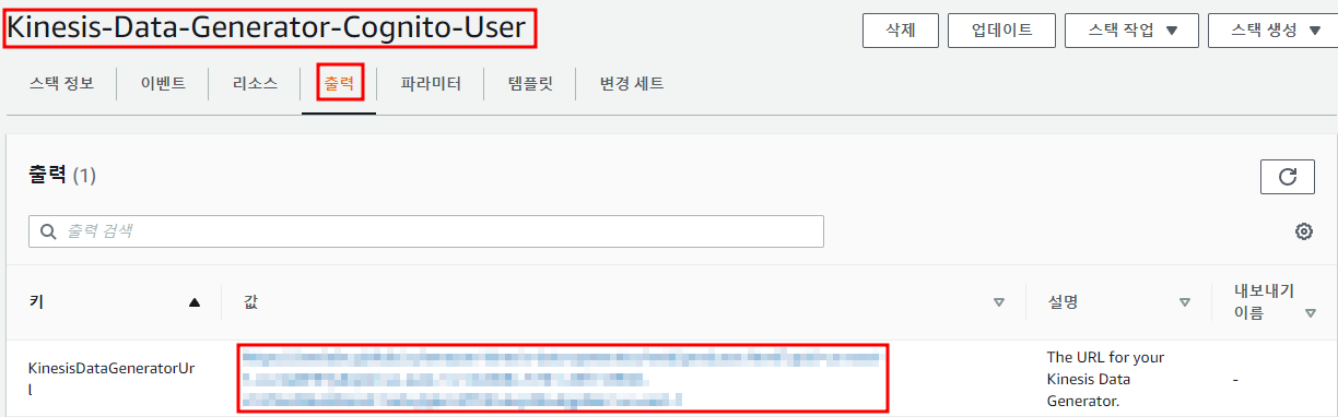 Kinesis-Data-Generator-Cognito-User 스택을 선택하고 출력탭으로 이동한다.