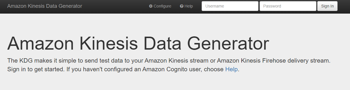 검토 단계를 진행 했다면 Amazon kinesis data generator 홈페이지로 연결되고, 이전에 지정한 아이디와 비밀번호로 로그인한다.