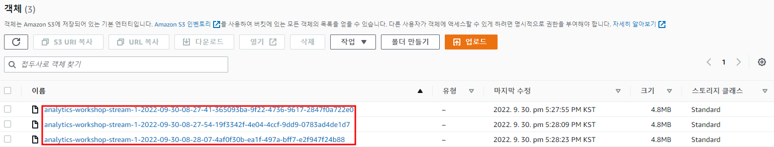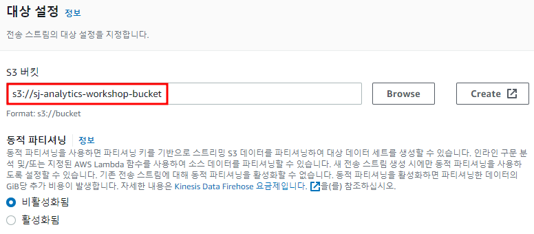 - 목적지 : s3/sj-analytics-workshop-bucket