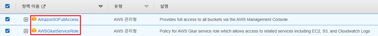 - AWSGlueServiceRole : Glue 관련 접근 권한