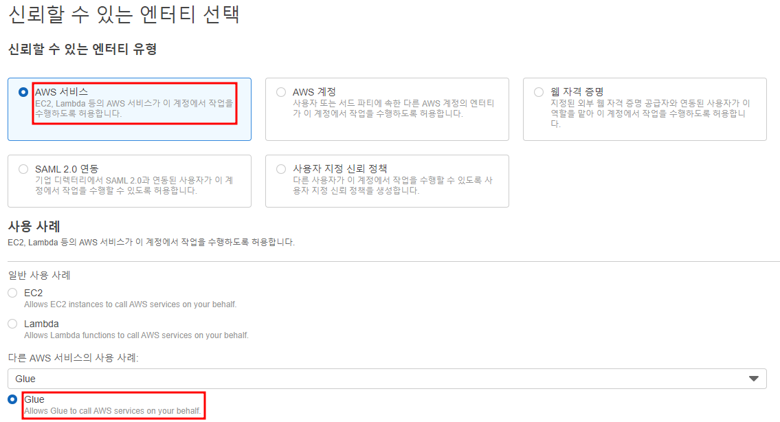 - 역할 만들기 - AWS서비스, Glue 서비스 선택