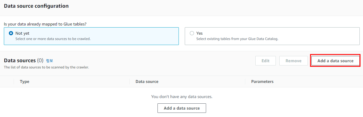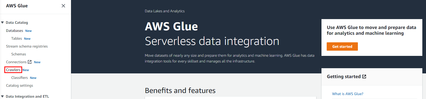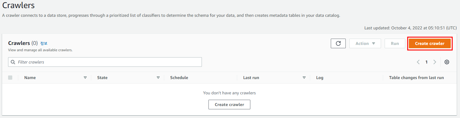 AWS Glue 콘솔 좌측 패널의 Crawlers 선택