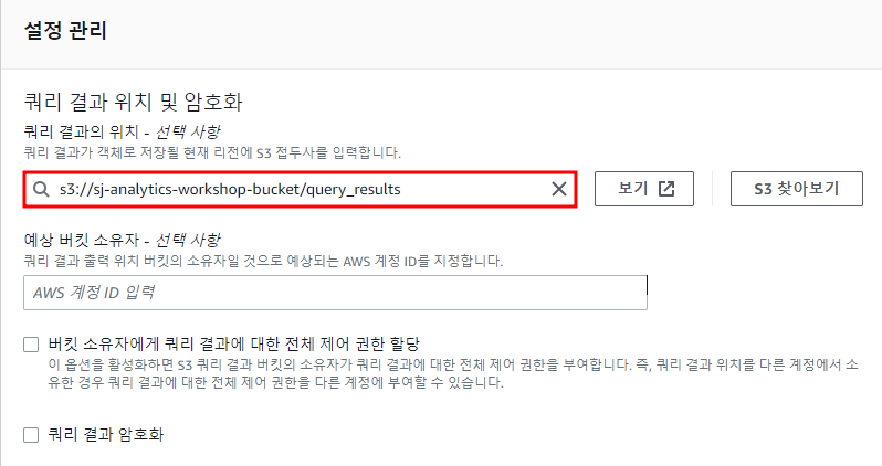 - setting → manage에 접속하여 s3://sj-analytics-workshop-bucket/query_results을 입력