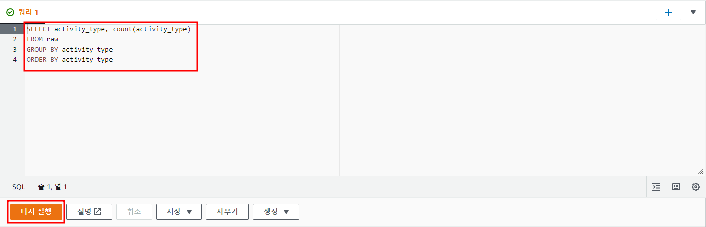 다시 편집기 탭에서 쿼리 작성 후 실행을 시켜본다.