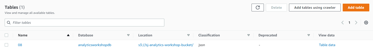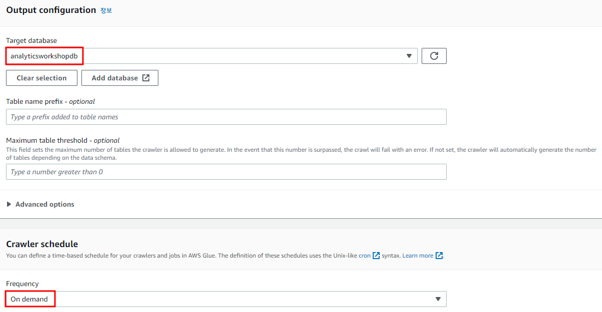 글루란 사실상 데이터베이스 안에 테이블을 만드는 것인데, 현재는 데이터베이스가 없으므로 Add database를 통해 analyticsworkshopdb라는 데이터베이스 생성 후 선택