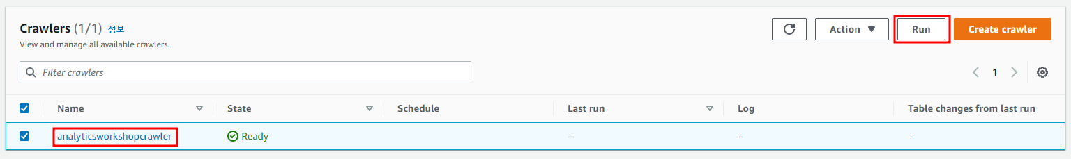 analyticsworkshopcrawler 체크 후 Run 버튼을 선택