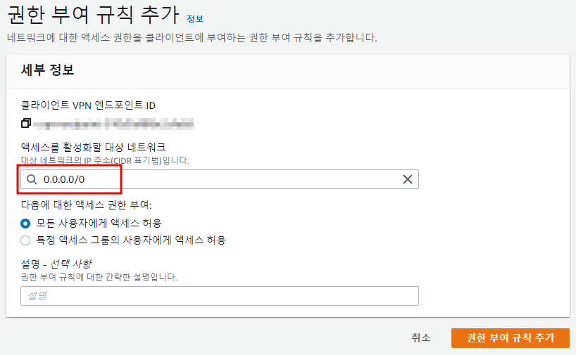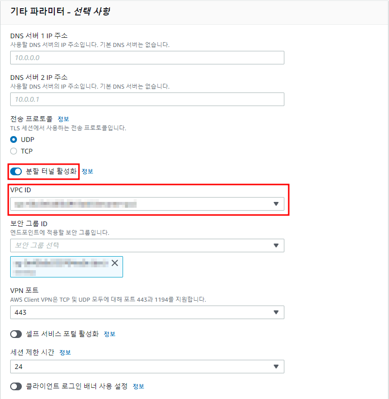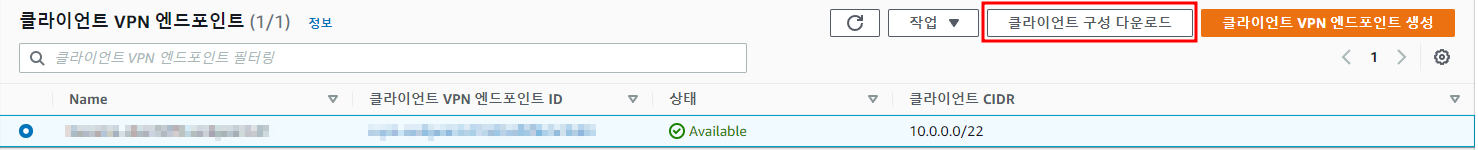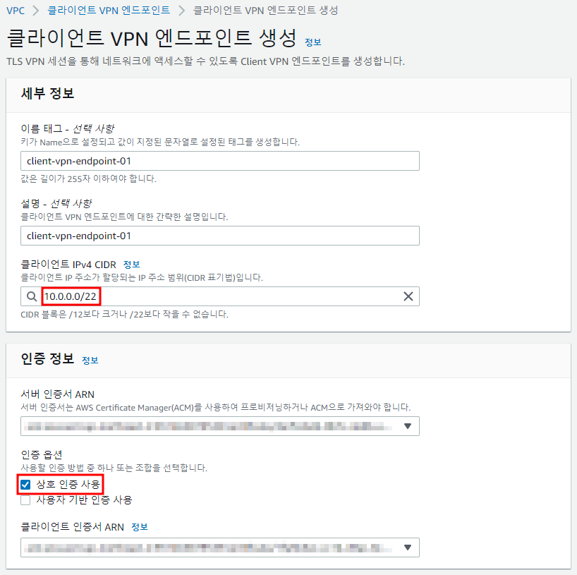 클라이언트 IPv4 CIDR : VPC CIDR 대역과 겹치지 않은 대역을 사용한다.