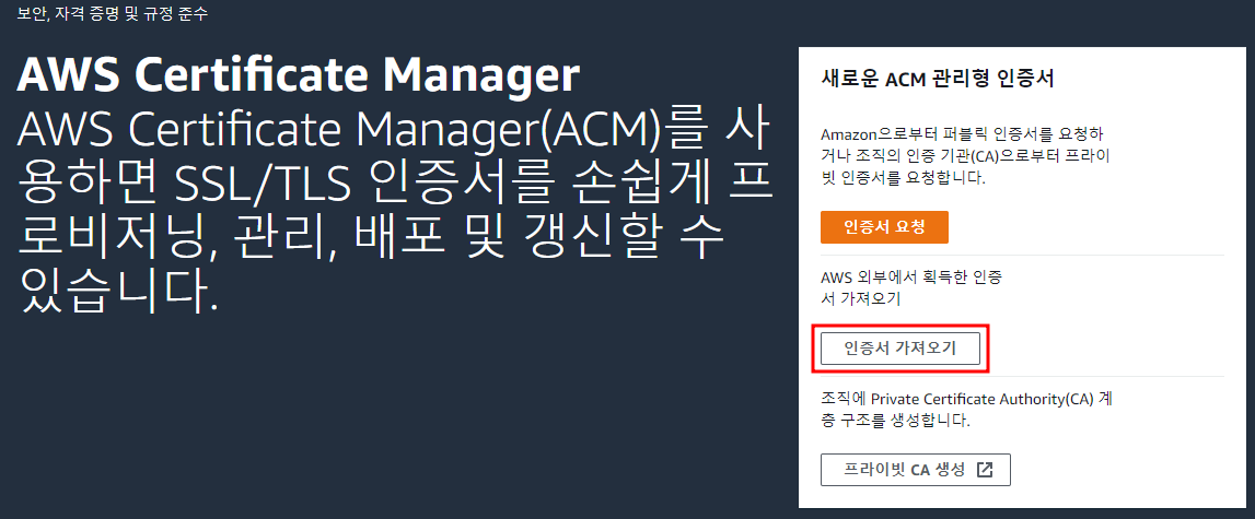 AWS Certificate Manager(ACM)에 접속해 인증서 가져오기를 클릭한다.