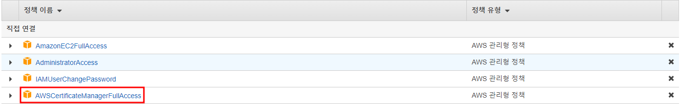 AWS Certificate Manager(ACM)에 인증서를 업로드 할 수 있는 사용자를 생성하거나 기존 사용자에게 권한을 부여한다.