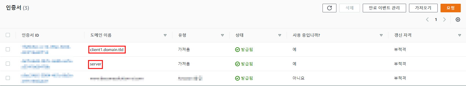 서버 인증서와 클라이언트 인증서가 AWS Certificate Manager로 가져왔다.