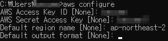 설치가 완료가 되면 cmd창에서 aws configure 명령어를 입력하여 아래와 같이 자격증명을 설정해준다.