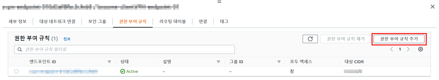 "권한부여" 탭으로 들어가 모든 트래픽(0.0.0.0/0)에 대한 접속을 허용할 수 있도록 수신승인 설정한다.