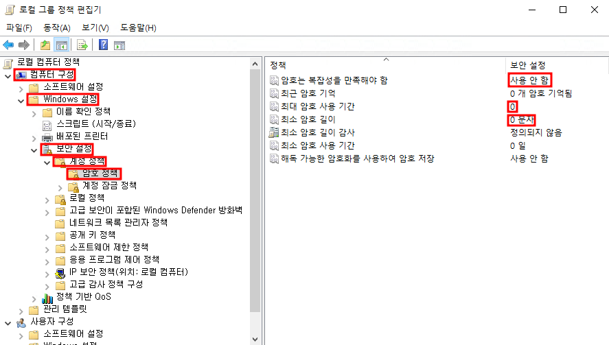 컴퓨터 구성 - Windows 설정 - 보안 설정 - 계정 정책 - 암호 정책으로 들어가