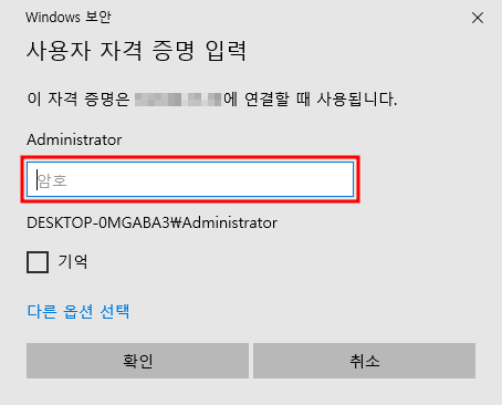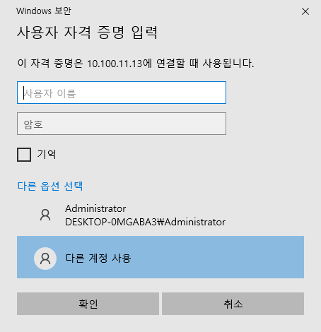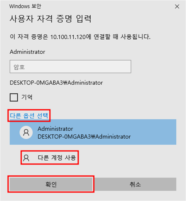 admin계정으로 들어갈 것이 아니기 때문에 다른 옵션 선택 - 다른 계정 사용 - 확인 을 눌러주면 사용자로 로그인 할 수