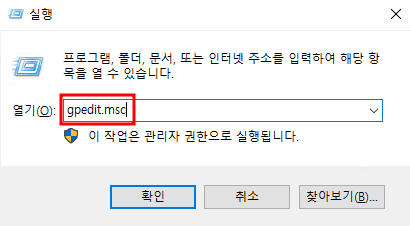 Admin 계정으로 접속해서 Window키 + R 로 실행환경을 열어주고 gpedit.msc를 친 후 확인을 눌러준다.
