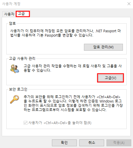 고급 - 고급 사용자 관리 - 고급으로 들어가준다.