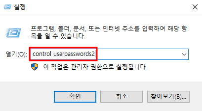 다시 Window키 + R 로 실행환경을 열어주고 control userpasswords2를 친 후 확인을 눌러준다.