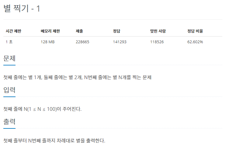 첫째 줄에는 별 1개, 둘째 줄에는 별 2개, N번째 줄에는 별 N개를 찍는 문제
