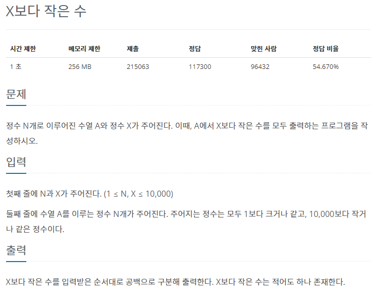 첫째 줄에 N과 X가 주어진다. (1 ≤ N, X ≤ 10,000) 둘째 줄에 수열 A를 이루는 정수 N개가 주어진다. 주어지는 정수는 모두 1보다 크거나 같고, 10,000보다 작거나 같은 정수이다.