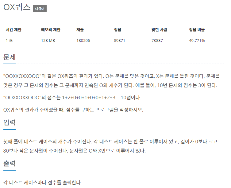 "OOXXOXXOOO"와 같은 OX퀴즈의 결과가 있다. O는 문제를 맞은 것이고, X는 문제를 틀린 것이다. 문제를 맞은 경우 그 문제의 점수는 그 문제까지 연속된 O의 개수가 된다. 예를 들어, 10번 문제의 점수