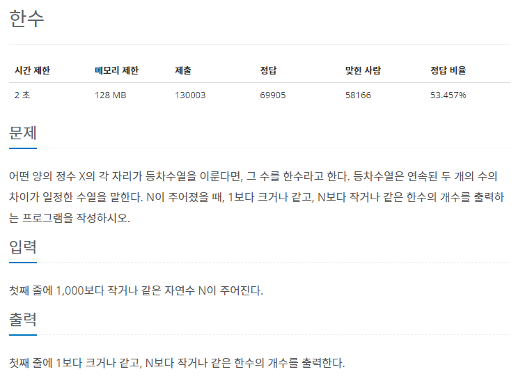 어떤 양의 정수 X의 각 자리가 등차수열을 이룬다면, 그 수를 한수라고 한다. 등차수열은 연속된 두 개의 수의 차이가 일정한 수열을 말한다. N이 주어졌을 때, 1보다 크거나 같고, N보다 작거나
